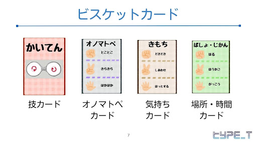 ビスケットカードは、技カード、オノマトペカード、気持ちカード、場所時間カードの4種類からできています。想定している遊び方はありますが、様々な遊び方を子供たちが思いつけるように、じゃんけんアイコンを取り入れたり、色を変えたりしています。